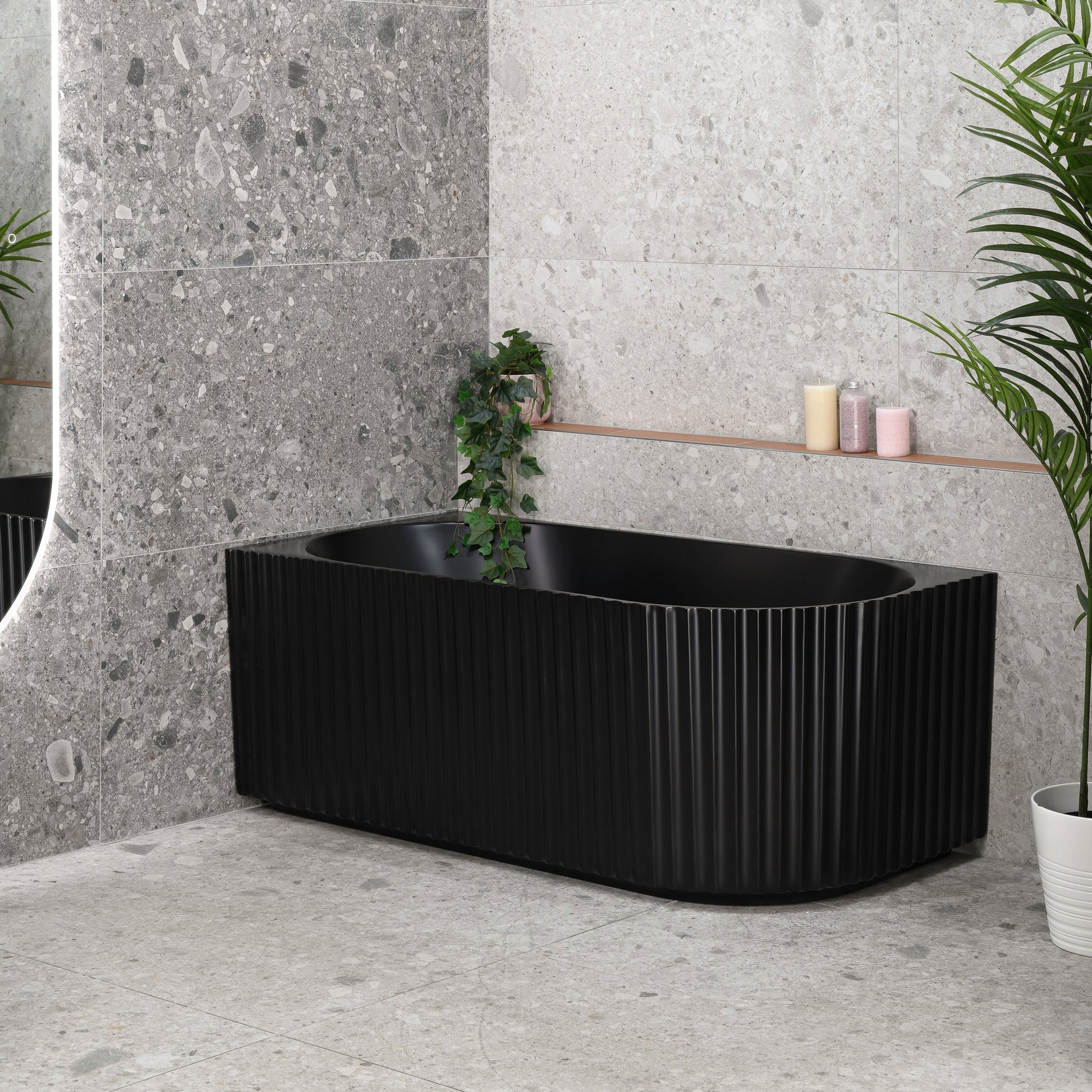 Enflair's Agora Groove fluted corner bath collection features eclectic design inspired by classical architecture, with decorative fluting reminiscent of the stone pillars which is perfect in any corner of your bathroom.