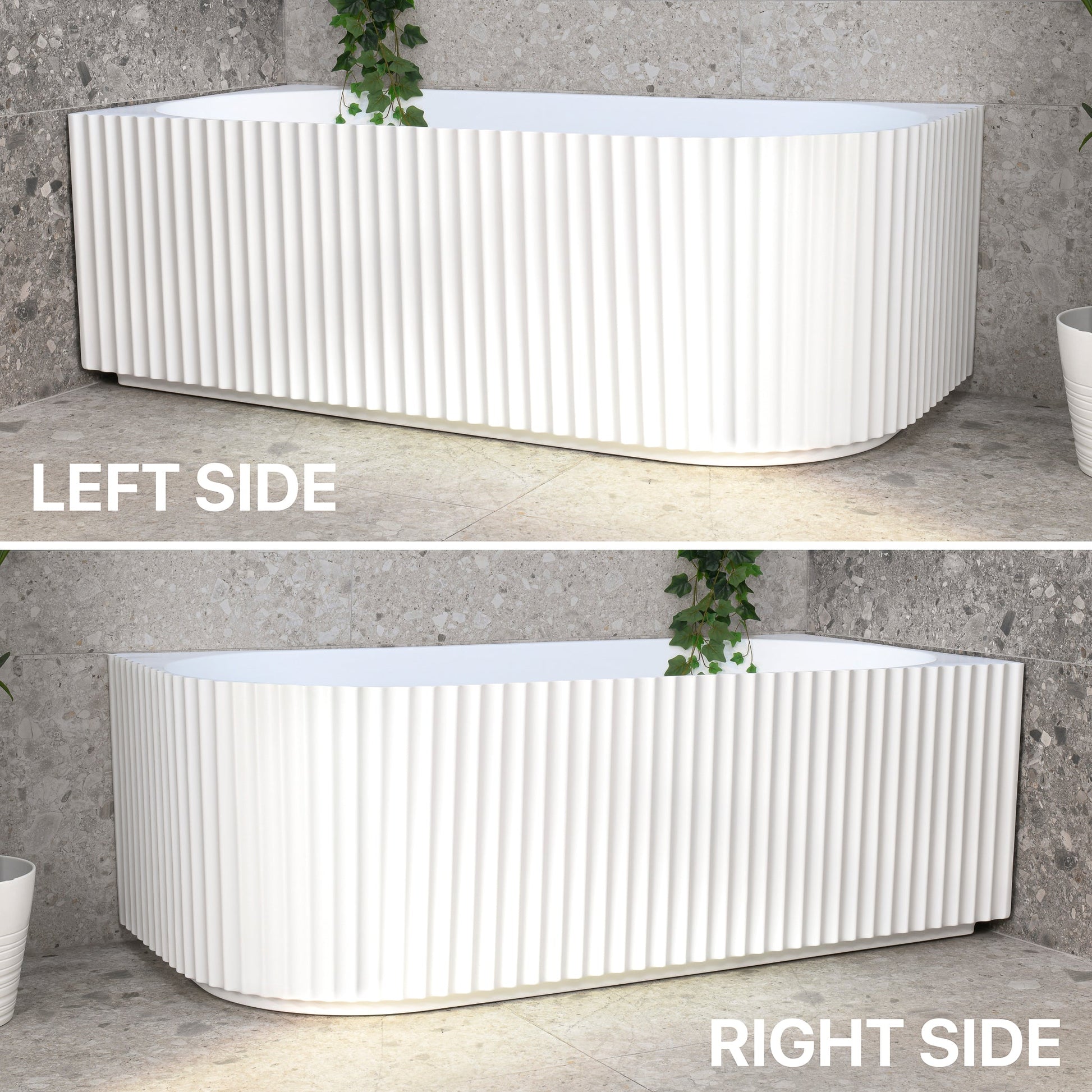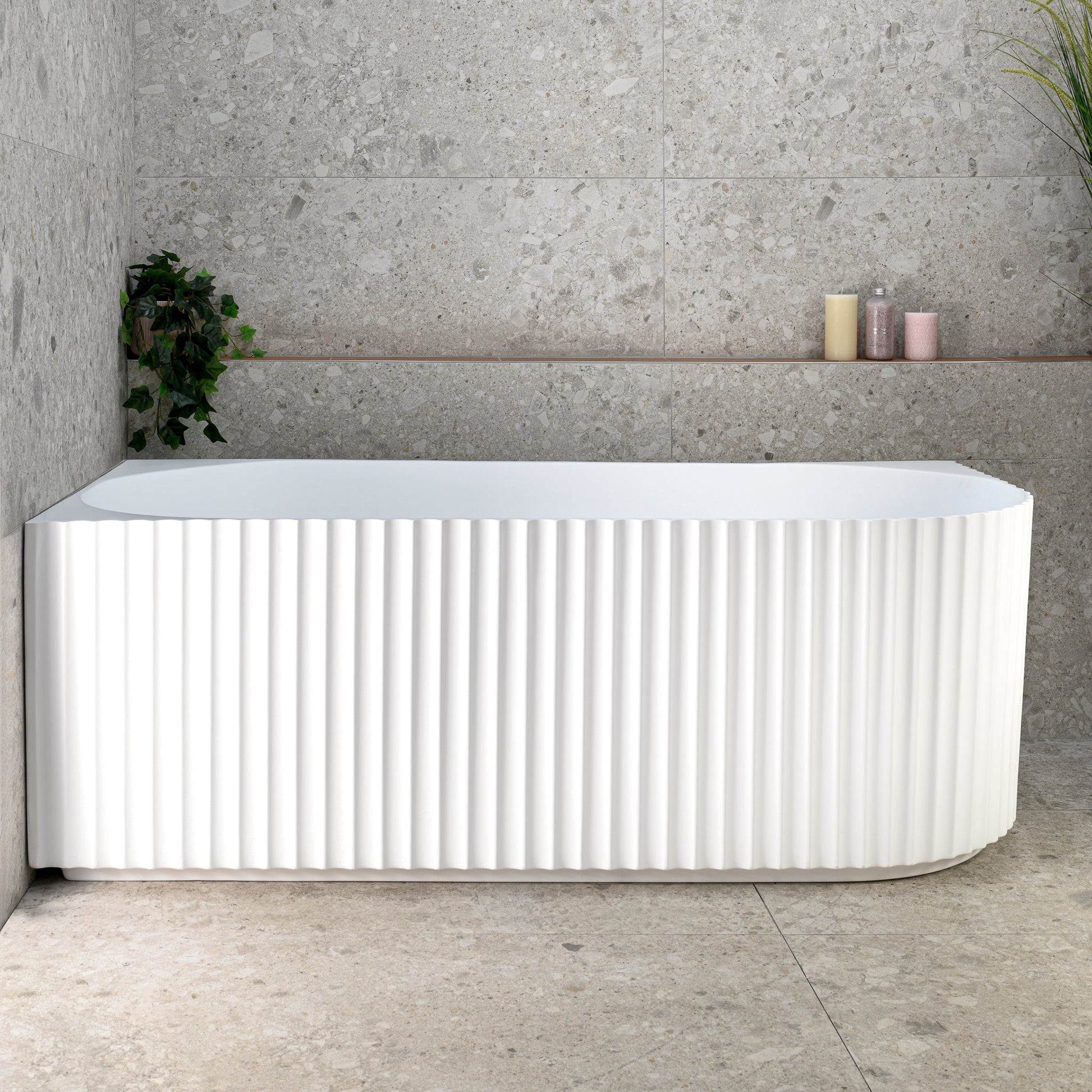 Enflair's Agora Groove fluted corner bath collection features eclectic design inspired by classical architecture, with decorative fluting reminiscent of the stone pillars which is perfect in any corner of your bathroom.