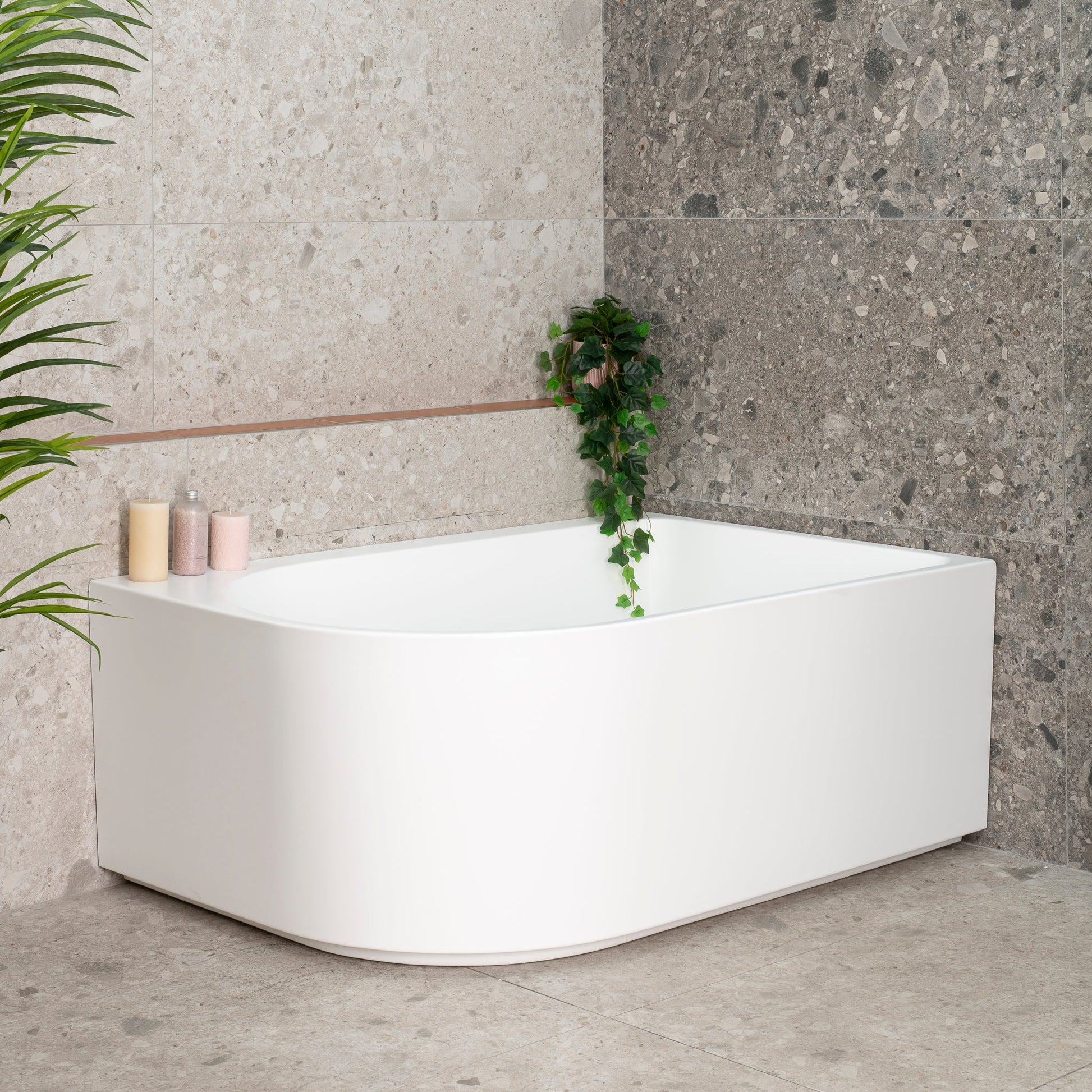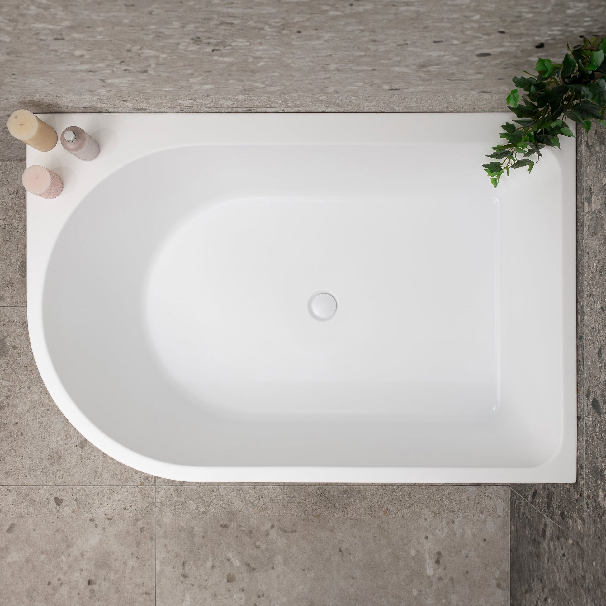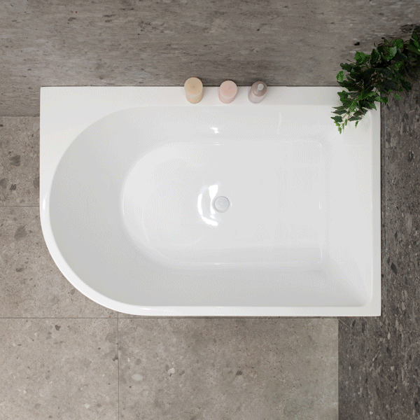 A brand new release! The Arco freestanding corner bath is available in right and left corner fit. With a rectangular shaped bottom on one side, this corner bath can be retrofitted with a shower and shower screen, as seen on the sample photos.