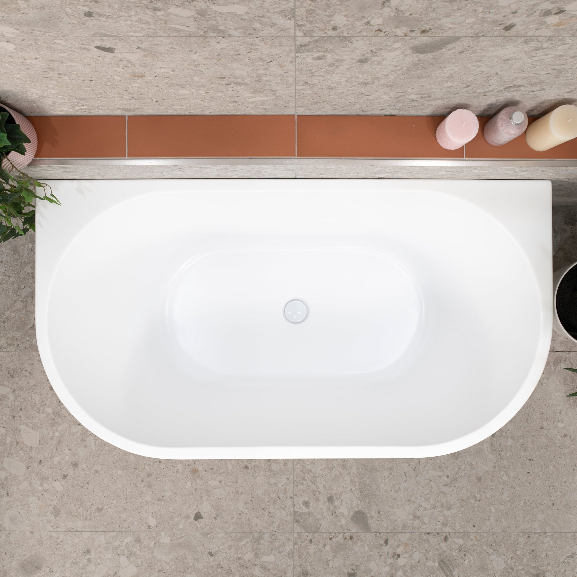 Curved beauty, the Avalon back to wall freestanding bath has a nice oval shape that curves with your back, making it one of the most comfortable baths.