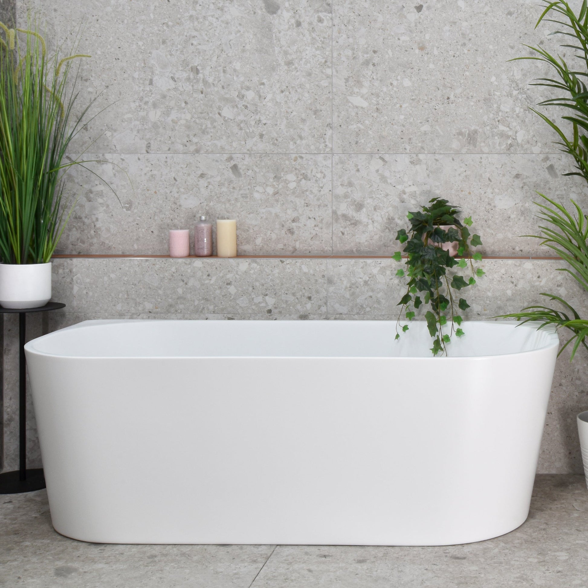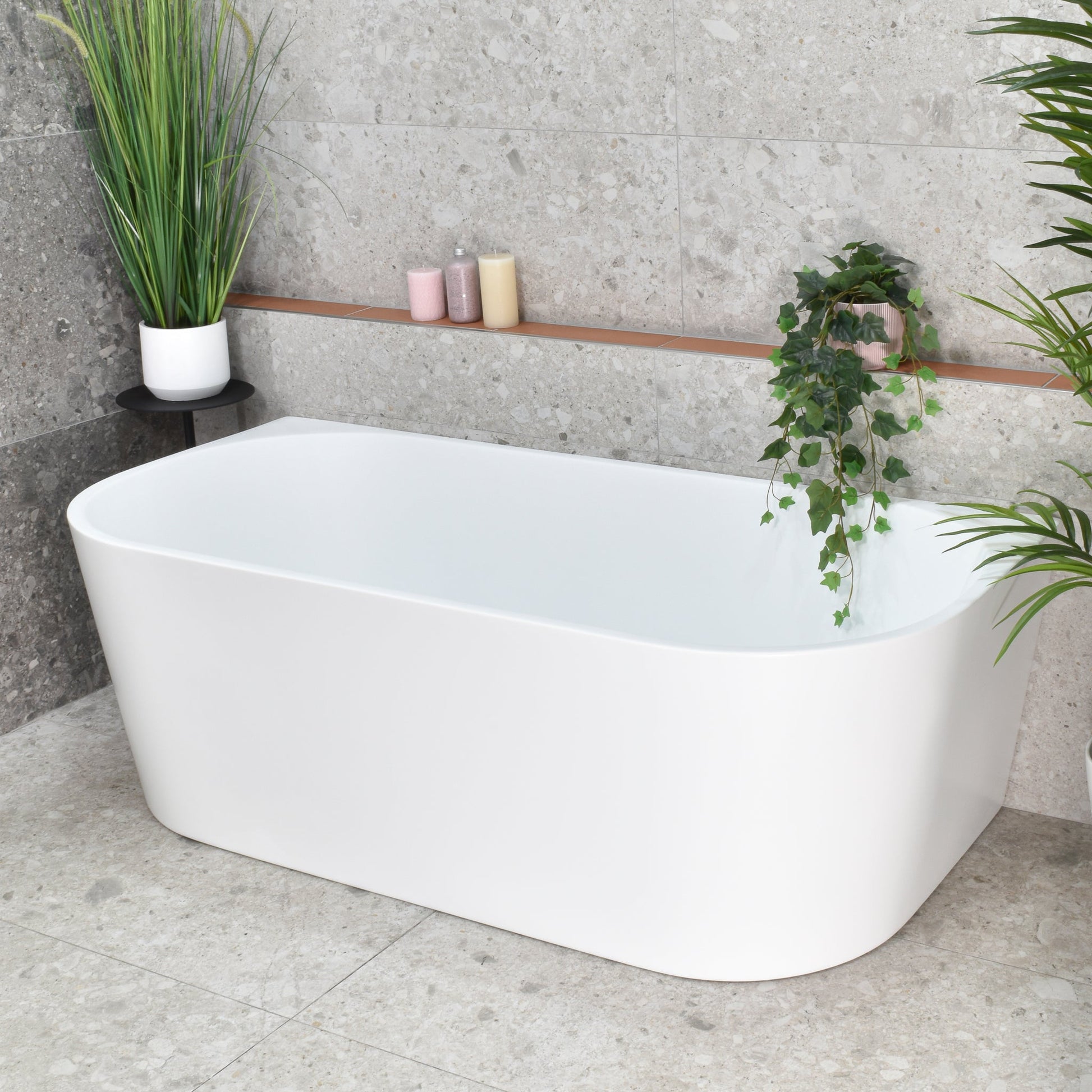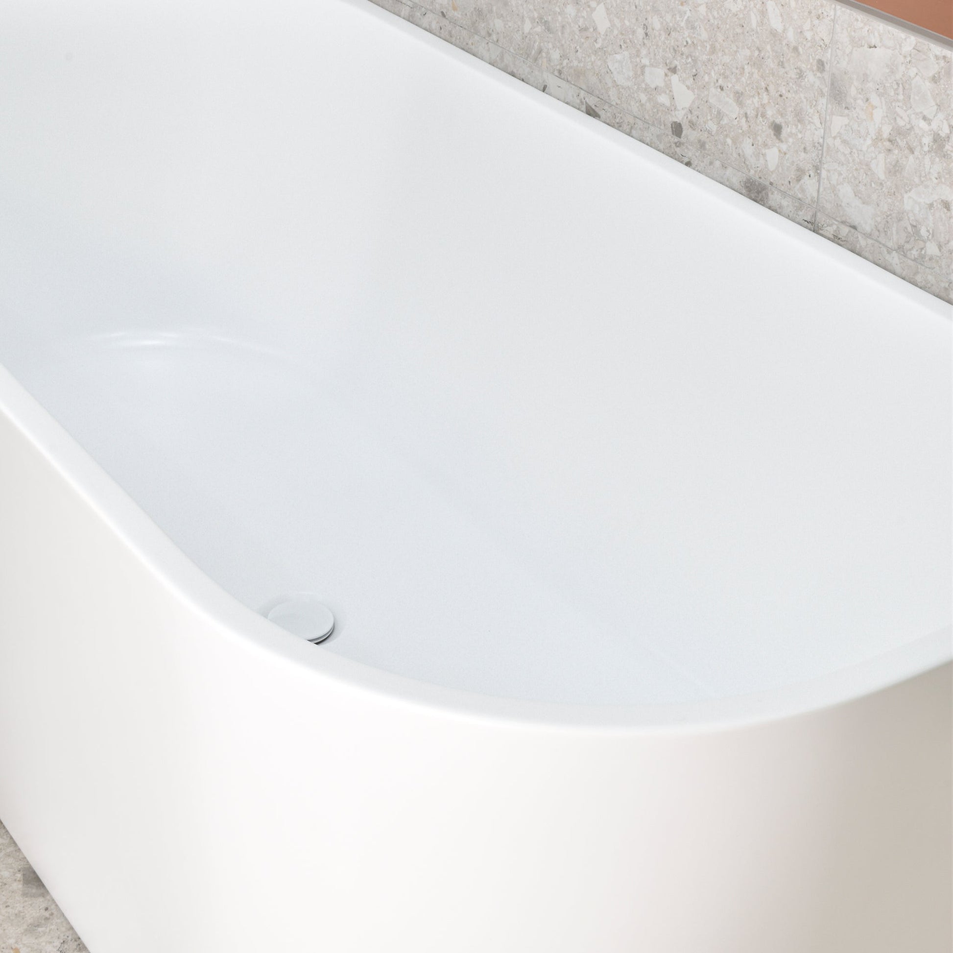 Curved beauty, the Avalon back to wall freestanding bath has a nice oval shape that curves with your back, making it one of the most comfortable baths.